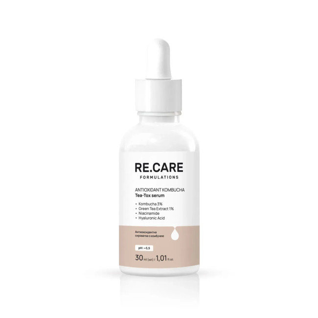 Антиоксидантная сыворотка с комбучей Antioxidant Kombucha Tea-Tox Serum Re.Care возвращает коже природное сияние, покой и глубокое увлажнение благодаря сочетанию ферментированных компонентов, растительных экстрактов и мягких уходных веществ.