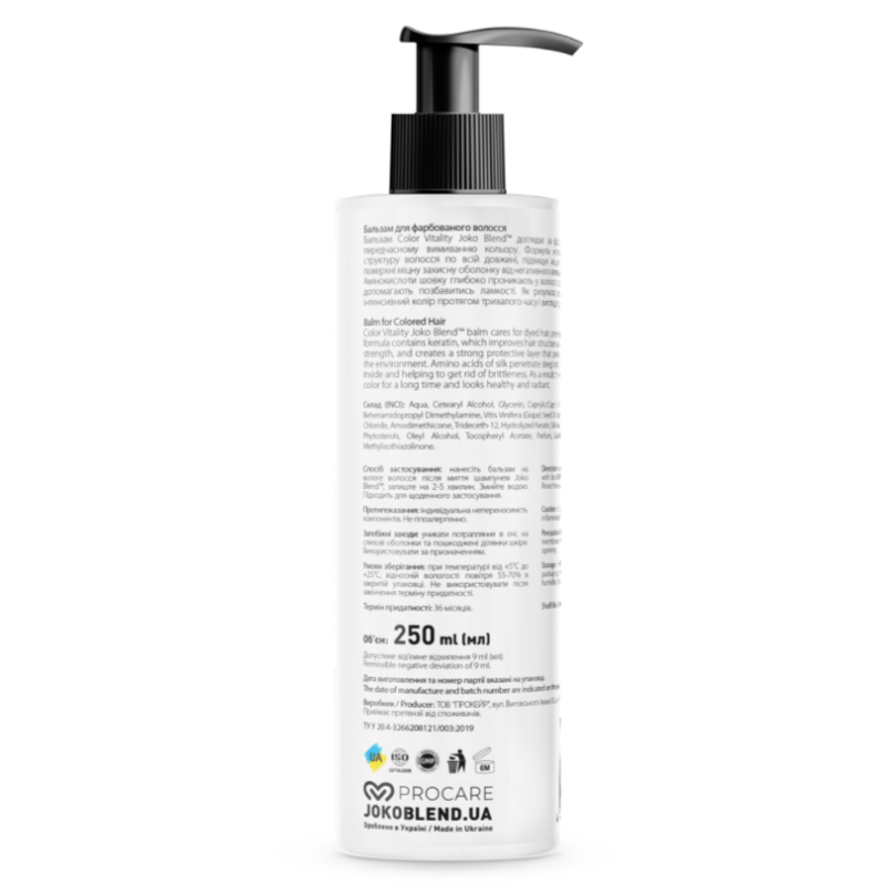Бальзам Color Vitality создан для ежедневного ухода за окрашенными волосами. Средство помогает сохранить насыщенность и яркость цвета, предотвращая преждевременное вымывание пигмента. Легкая формула средства не утяжеляет волосы, оставляя их объемными и блестящими. В составе кератин глубоко восстанавливает структуру волос, повышает их прочность и эластичность, при этом создает защитный барьер от негативного воздействия окружающей среды. Аминокислоты шелка - обеспечивают интенсивное увлажнение, придают волосам гладкость, мягкость и естественный блеск. Бальзам сохраняет яркость цвета, блеск и его интенсивность. Средство от Joko Blend сочетает активные компоненты, которые эффективно восстанавливают поврежденные волосы.