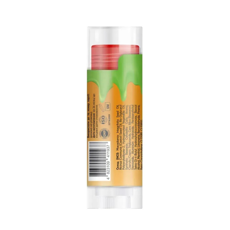 Состав: Macadamia Integrifolia Seed Oil, Ricinus Communis (Castor) Seed Oil, Bis-Diglyceryl Polyacyladipate-2, Hydrogenated Vegetable Oil, Synthetic Beeswax, Candelilla Cera, Aroma, Caprylic/Capric Triglyceride, Cera Alba (Beeswax), Stevioside, Aluminum Hydroxide, Pentaerythrityl Tetra-Di-t-Butyl Hydroxyhydrocinnamate, Benzyl Alcohol, Menthol, Limonene, Benzaldehyde, Pinene, Beta-Caryophyllene, CI 12085, CI 15850.