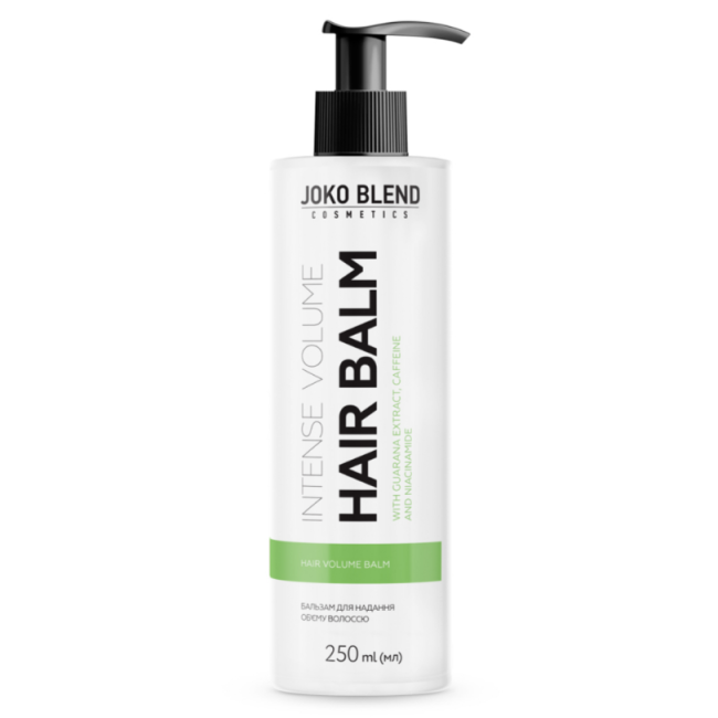 Бальзам Intense Volume разработан для поддержания естественного объема, стимуляции роста и улучшения общего состояния волос. Активная формула уплотняет структуру локонов, интенсивно увлажняет их и придает естественный блеск. В составе есть экстракт гуараны - мощный источник, который повышает его прочность и эластичность. Кофеин - активизирует жизненные процессы в структуре волос и способствует укреплению локонов от корней до кончиков. Ниацинамид - стимулирует синтез кератина, помогает предотвратить сечение кончиков и делает волосы более крепкими. Бальзам улучшает микроциркуляцию кожи головы, способствует питанию волосяных луковиц, возвращает волосам эластичность и выразительный прикорневой объем. Средство от Joko Blend делает локоны мягкими, шелковистыми и послушными.