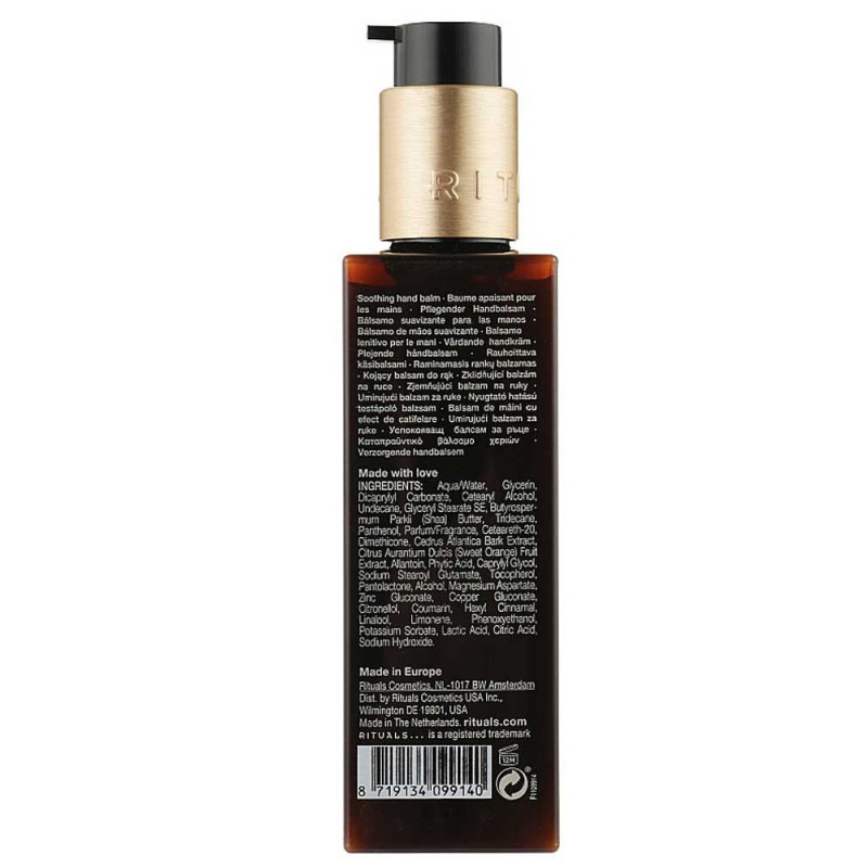 Очарование и заботливый уход с нашим бальзамом для рук Hand Balm Ritual of Mehr, разработанным для интенсивного увлажнения и защиты вашей кожи. Благодаря уникальной формуле, основанной на чистой воде и глицерине, этот бальзам моментально впитывается, не оставляя ощущение липкости, обеспечивая глубокое увлажнение. Дикаприл карбонат и цетеариловый спирт создают невидимый защитный барьер, удерживающий влагу, делая кожу мягкой и эластичной даже после частого мытья. Ваши руки будут выглядеть ухоженными и здоровыми каждый день.