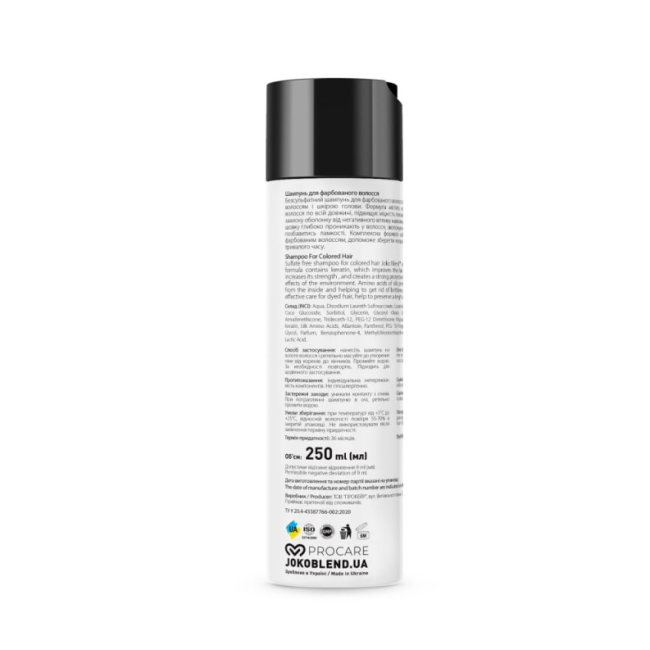 Безсульфатный шампунь Color Vitality - создан для деликатного очищения и комплексного ухода за окрашенными волосами. Формула шампуня без сульфатов бережно очищает волосы и кожу головы, не вымывая пигмент. Шампунь помогает сохранить яркость и насыщенность цвета. В составе есть кератин, который помогает восстановить структуру волос по всей длине, укрепляет локоны и формирует защитный барьер от негативного воздействия окружающей среды. Аминокислоты шелка - глубоко проникают в волосяное волокно, интенсивно увлажняют его изнутри, уменьшая ломкость и придавая волосам мягкость. При регулярном использовании шампунем от Joko Blend волосы выглядят ухоженными, сияющими и шелковистыми по всей длине, а цвет остается стойким и насыщенным.