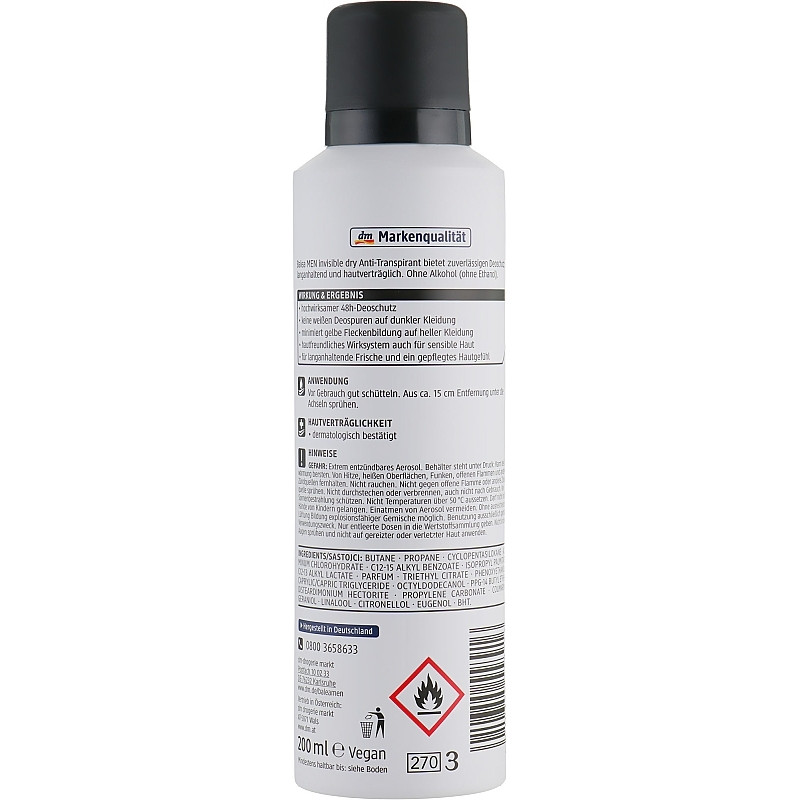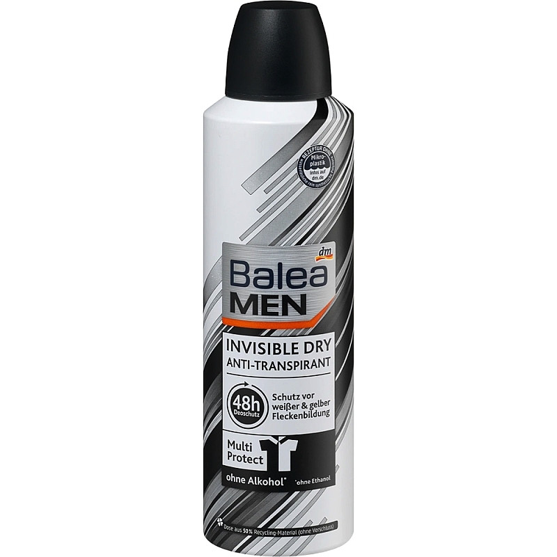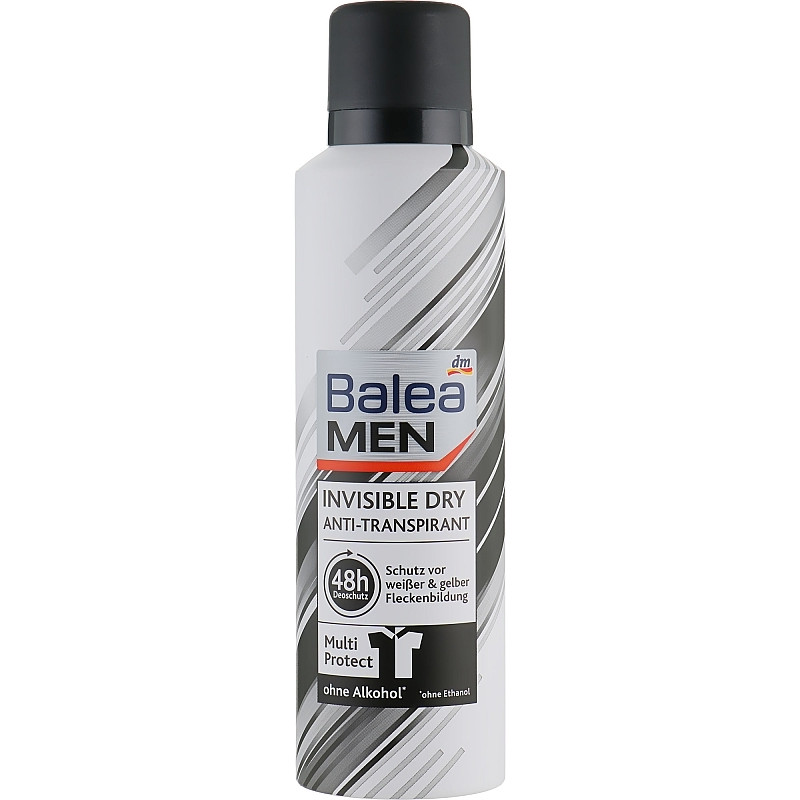 Дезодорант Men Invisible Dry Anti-Transpirant - обеспечивает надежную защиту от запаха пота и пятен на одежде, которые могут возникнуть при необычных ситуациях. Средство обеспечивает ощущение свежести на 48 часов, гарантирует комфорт кожи при нанесении. Дезодорант идеально подойдет для чувствительной кожи, поскольку не имеет спирта и компонентов, которые раздражают кожу. Он обладает приятным запахом, позволяет коже дышать и не пересушивает кожу.Его название «Невидимый» характеризует, как средство, которое совсем не ощущается на коже, но делает кожу ухоженной. Средство от Balea подойдет для уверенных мужчин. которые заботятся о коже и своей одежде.