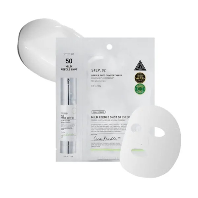 Двухэтапная маска для лица VT Cosmetics Mild Reedle Shot 50 2-Step Mask обеспечивает комплексный уход, направленный на обновление, глубокое увлажнение и успокоение кожи.