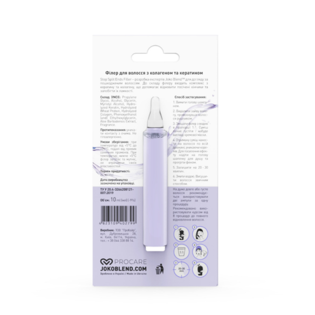 Филлер для волос Stop Split Ends Filler - создан для поврежденных волос, для восстановления кончиков, уменьшения ломкости и улучшения общего состояния волос. В составе есть кератин - проникает в кутикулу волоса и заполняет микроповреждения. Он укрепляет структуру волос, делает их гладкими и крепкими, повышает эластичность и уменьшает ломкость. Коллаген - интенсивно удерживает влагу в структуре волос, визуально утолщает волосы, придавая им объем. Средство демонстрирует интенсивное увлажнение, заметное уплотнение волос, предотвращает спутывание. Филлер от Joko Blend создает зеркальный блеск и ухоженный вид после первого применения.