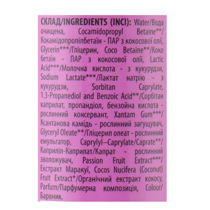 Состав: Water, Cocamidopropyl Betaine, Glycerin, Coco Betaine, Lactic Acid, Sodium Lactate, Composition (Sorbitan Caprylate,1.3-Propanediol and Benzoic Acid),Xantam Gum, Parfum, Glyceryl Oleate, Caprylyl–Caprylate/Caprate, Passion Fruit Extract, Cocos Nucifera (Coconut) Fruit Extract, Colour.