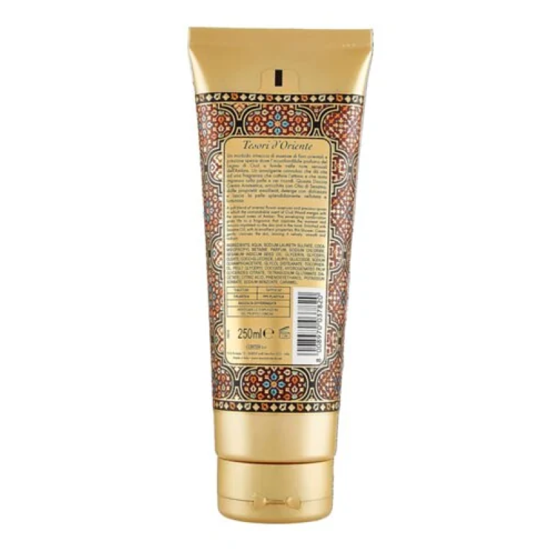 Гель для душа Royal Oud - средство, которое сочетает в себе уход за телом и роскошную парфюмерную композицию. Средство деликатно очищает кожу от загрязнений, излишка себума и ороговевших клеток, не пересушивая ее и не вызывая ощущения стянутости. Кремовая густая текстура легко пенится, мягко обволакивает тело и легко смывается, оставляя кожу увлажненной, мягкой и ухоженной. Аромат геля сочетает в себе восточно-цветочные эссенции, где доминирует благородная нота дерева уд. Амбра смягчает композицию, придавая ей тепло и глубину. Гель имеет стойкий приятный аромат, который подходит для ежедневного использования. Средство не содержит парабенов, красителей и минеральных масел. Гель от Tesori d`Oriente упакован в удобный тюбик с цепочкой, что очень практично в использовании.