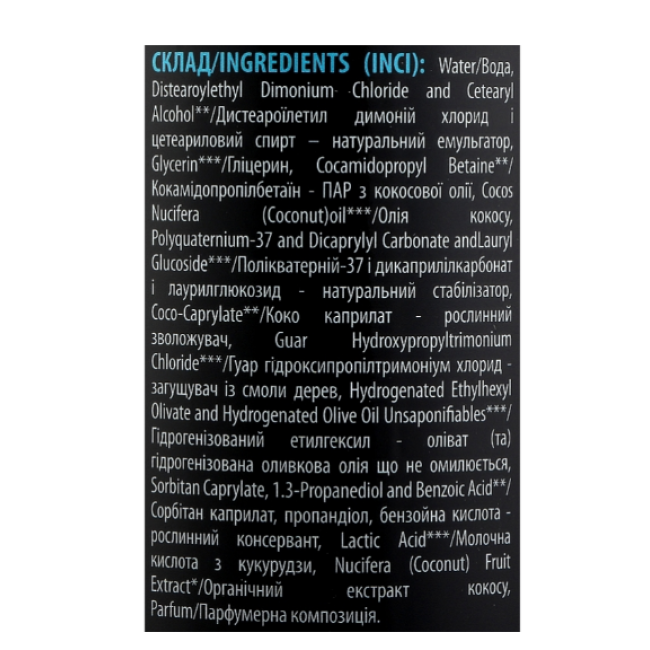 Состав: Water (вода), Composition (Distearoylethyl Dimonium Chloride and Cetearyl Alcohol) (натуральный эмульгатор), Cetearyl Alcohol (эмульгатор из растительных масел), Glycerin (растительный глицерин), Cocamidopropyl Betaine (ПАВ из кокосового масла), Composition (Sorbitan Caprylate,1.3-Propanediol and Benzoic Acid)(растительный консервант), Cocos Nucifera (Сoconut)oil(кокосовое масло), Composition (Polyquaternium-37 and Dicaprylyl Carbonate andLauryl Glucoside) (натуральный стабилизатор), Coco-Caprylate(растительный увлажнитель), Guar Hydroxypropyltrimonium Chloride (загуститель из смолы деревьев), Composition (Hydrogenated Ethylhexyl Olivate, Hydrogenated Olive Oil Unsaponifiables) (растительный силикон), Lac (молочная кислота из кукурузы), Nucifera (Coconut) Fruit Extract (органический экстракт кокоса), Parfum.