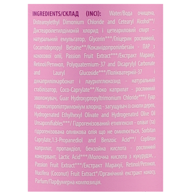 Состав:Water, Composition (Distearoylethyl Dimonium Chloride and Cetearyl Alcohol), Cetearyl Alcohol, Glycerin, Cocamidopropyl Betaine, Composition (Sorbitan Caprylate,1.3-Propanediol and Benzoic Acid), Passion Fruit Extract, Composition ( Polyquaternium-37 and Dicaprylyl Carbonate andLauryl Glucoside), Coco-Caprylate, Guar Hydroxypropyltrimonium Chloride, Composition (Hydrogenated Ethylhexyl Olivate, Hydrogenated Olive Oil Unsaponifiables), Lactic Acid, Nucifera (Coconut) Fruit Extract, Parfum.