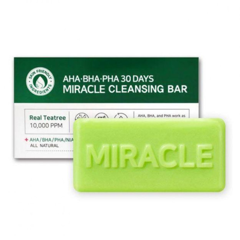 Косметическое натуральное мыло Some By Mi, AHA. BHA. PHA 30 Days Miracle Cleansing Bar - лучший очищающий продукт для проблемной и склонной к воспалениям, раздражениям кожи лица и тела. Мыло удаляет с кожи грязь, раскупоривает поры, выводя оттуда кожный жир и загрязнения. Мыло на раздраженный и покрасневших участках выполняет роль своеобразного антистресса, оказывая противовоспалительное воздействие, убирает воспаления, борется с акнэ и угревой сыпью. Имеет ранозаживляющий и отшелушивающий эффекты. Результат достигается через 30 дней регулярного применения.