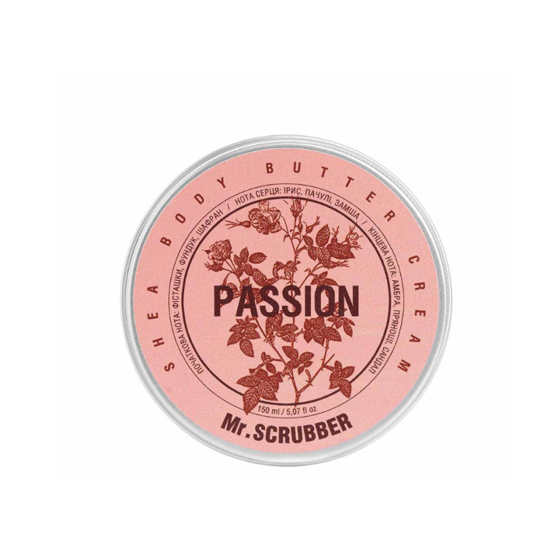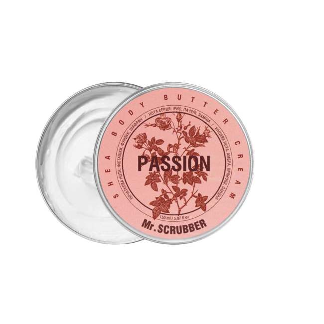 Крем-баттер Passion - превращает ежедневный ритуал ухода в настоящее удовольствие. Средство глубоко питает и восстанавливает кожу, заметно улучшает ее текстуру и цвет, насыщает витаминами и жирными кислотами. Нежная текстура мгновенно впитывается, даря коже мягкость, упругость и интенсивное увлажнение. Крем-бартер не только проявляет себя, как ухаживающее средство, а и окутывает тело роскошным восточным ароматом, где ощутимы нотки пряностей, сандалового дерева и амбры. В составе присутствует масло ши - глубоко увлажняет, успокаивает, смягчает и защищает кожу, его питательные компоненты проникают в глубокие слои кожи, укрепляя ее барьер и предотвращая воздействие солнечных лучей. Масло персиковых косточек - устраняет сухость и шелушение, повышает упругость, смягчает и осветляет пигментные пятна. Витамин Е - мощный антиоксидант, защищает клетки кожи, поддерживает ее молодость и способствует заживлению микротрещин. Средство от Mr.SCRUBBER обеспечивает глубокое увлажнение и питание, при этом оставляя стойкий и чувственный аромат с восточным характером.