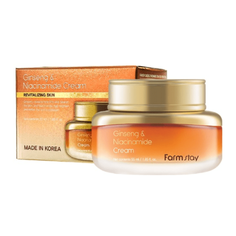 Крем для лица JINSHENG & NIACINAMIDE CREAM - средство мягко корректирует признаки возрастных изменений, восстанавливает энергию уставшей кожи и дарит ей ухоженный и свежий вид. В составе есть экстракт женьшеня, который повышает эластичность, плотность кожи, стимулирует микроциркуляцию и наполняет клетки энергией. Он помогает бороться с оксидантным стрессом и укрепляет естественный защитный барьер. Ниацинамид - выравнивает тон лица, уменьшает пигментацию и следы постакне. Усиливает гидролипидный барьер, укрепляет сосуды и обладает антикуперозным действием. Экстракт алоэ вера - обеспечивает антиоксидантный, антибактериальный и успокаивающий эффект, ускоряет заживление мелких повреждений и тонизирует кожу. Глутатион - осветляет пигментацию, улучшает обмен веществ и микроциркуляцию, способствует выравниванию тона лица. Средство от FARMSTAY возвращает коже молодость, тонус и сияние.