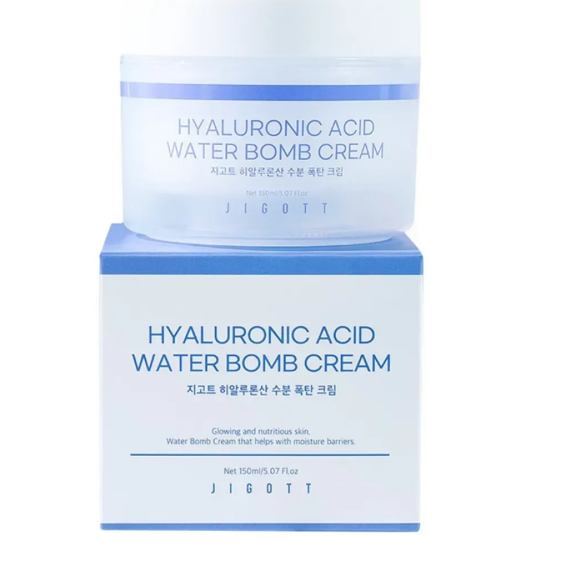 Крем для лица Hyaluronic Acid Water bomb Cream - подарит долговременное увлажнение, улучшит эластичность и укрепит защитный барьер. В составе есть гиалуроновая кислота различной формы, которая глубоко проникает в слои кожи, эффективно поддерживает влагу и стимулирует выработку естественного коллагена. Экстракт василька - проявляет свое антиоксидантное, противовоспалительное и очищающее действие. Экстракт ромашки - известен успокаивающими, антисептическими свойствами и помогает уменьшить раздражение. Крем имеет невесомую водянистую структуру, которая мгновенно увлажняет, даря ощущение свежести и комфорта. Благодаря комплексу гиалуроновой кислоты, кожа становится гладкой, упругой и защищает от преждевременного старения. Крем выравнивает тон лица, ускоряет регенерацию кожи и повышает устойчивость кожи к внешнему воздействию. Средство от Jigott станет помощником в ежедневном уходе. особенно когда нужно восстановить кожу.
