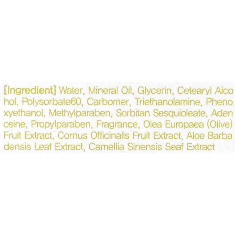 Состав: Water, cetearyl alcohol, cyclopentasiloxane, polysorbate 60, Carbomer, triethanolamine (TEA), mineral oil, urea, dimethicone, Methylparaben, sesquioleic acid sorbitan, olive extract, propylparaben, aloe bavadensis leaf extract, Tomirurela puchimoline extract, corysea extract, Yellow No. 5, Blue No. 1, fragrance.