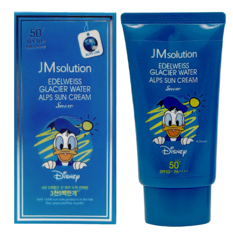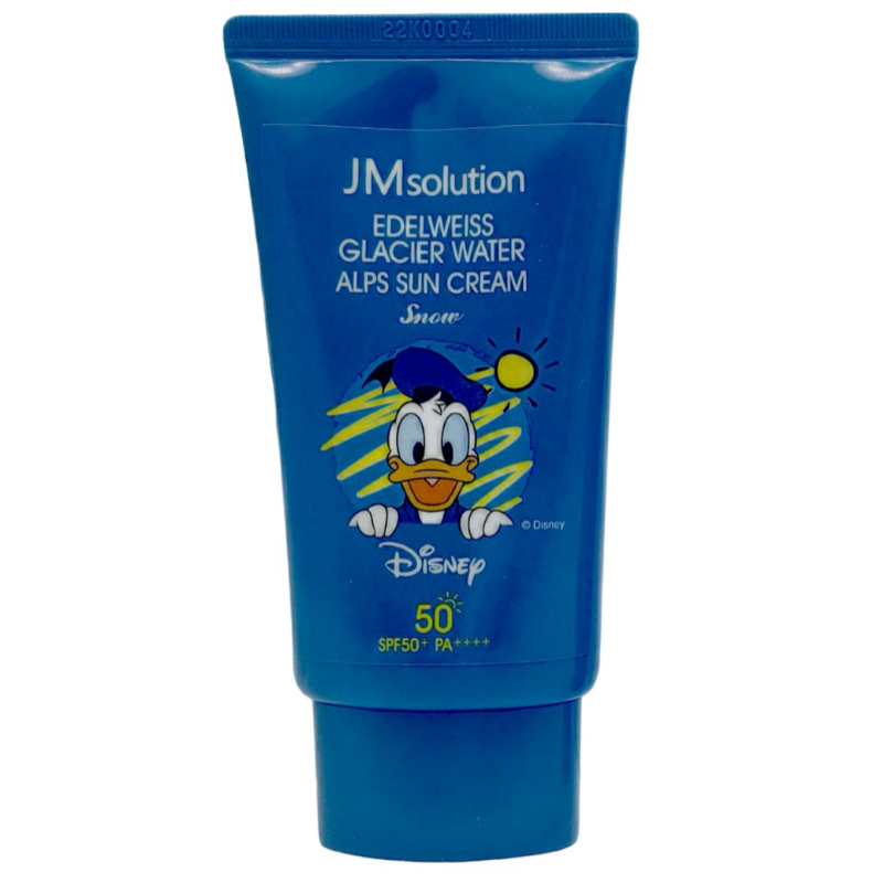Крем Edelweiss Glacier Water Alps Sunscreen Snow x Disney Donald Duck - обеспечивает защиту от UVA- и UVB-излучения, предотвращает фотостарение и появление морщин. В составе есть комплекс Calming Complex, который состоит из экстракта ламинарии, пшеницы, алоэ вера и дарят раздраженной коже ощущение прохлады и комфорта. В креме нет масла, поэтому он почти не ощущается на коже. Ниацинамид - смягчает кожу, нормализует выработку себума и улучшает микроциркуляцию. Стволовые клетки - защищают от ультрафиолета и фотостарения. Три вида гиалуроновой кислоты - поддерживают водный баланс, уплотняют кожу и предотвращают старение. Экстракт центеллы азиатской - удерживает влагу в эпидермисе, укрепляет барьерные функции кожи, способствует восстановлению и заживлению. Витамин Е - предотвращает появление пигментных пятен и борется с последствиями окисления. Средство от Jmsolution обеспечивает осветление, разглаживание, а главное защиту от ультрафиолета.