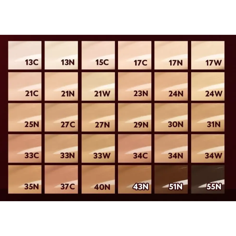 13C Fair – самый светлый цвет, для очень светлой кожи; 13N Fair Ivory – для очень светлой кожи с нейтральным подтоном; 15C Fair Porcelain – для светлой кожи, фарфоровый; 17C Porcelain – для светлой кожи с холодным подтоном; 17N Vanilla – для светлой кожи с натуральным подтоном; 17W French Vanilla – для светлой кожи с теплым подтоном;