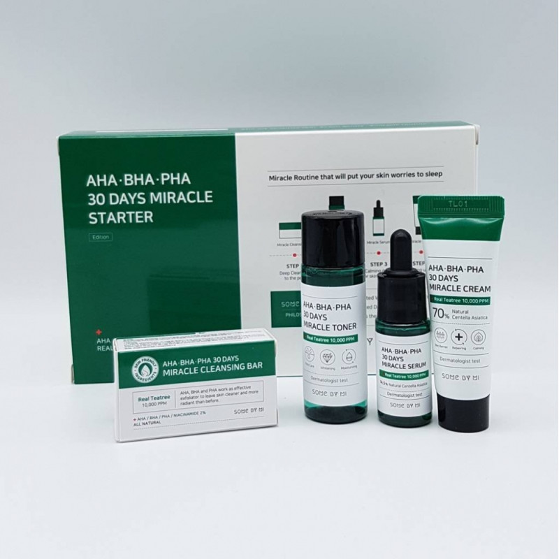 Набор 30 Days Miracle Starter Kit Some By Mi сочетает в себе четыре средства для ухода за чувствительной и проблемной кожей: мыло, тонер, сыворотка и крем для лица.