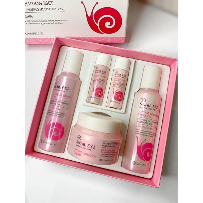 Набор Snail EX2 intense solution 3 Set - состоит из трех продуктов: тонера, эмульсии и крема. В основе средств улиточный муцин, который оказывает укрепляющее и регенерирующее действие, активизирует метаболизм клеток.