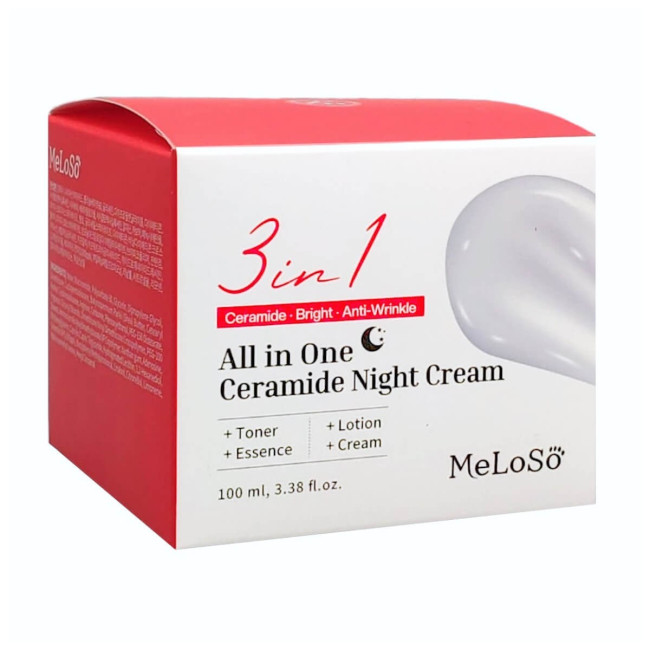 Ночной крем с церамидами универсальный Meloso 3in1 All in One Ceramide Night Cream создан, чтобы работать в самое важное время – когда кожа отдыхает и восстанавливается. Его основа – ниацинамид, мощный мультифункциональный ингредиент, который выравнивает тон, уменьшает следы усталости и пигментацию, одновременно укрепляя естественный барьер кожи. В сочетании с глицерином, дипропиленгликолем и каприлом/каприновыми триглицеридами он дарит интенсивное увлажнение, которое длится всю ночь.