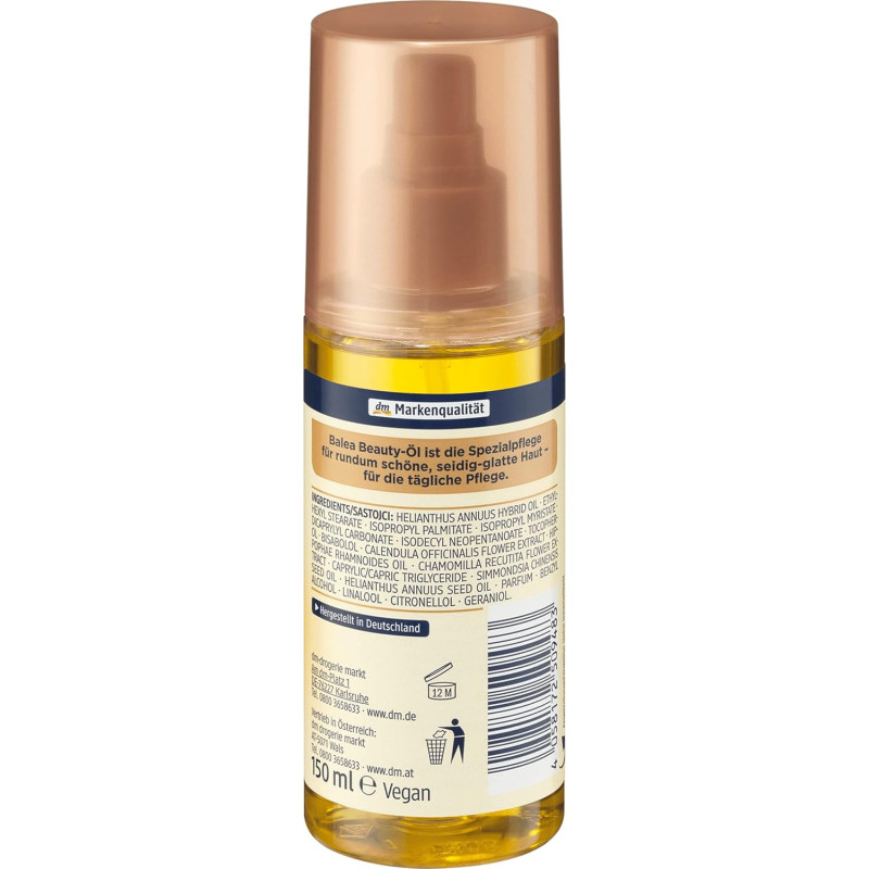 Масло для тела Beauty-Öl - подарит коже блеск и насытит питательным маслом. Формула средства проявляет пять действий в одном масле. Оно ухаживает за шрамами, помогает уменьшить ощущение стянутости, делая кожу мягкой и эластичной. Масло для олии уменьшает видимость растяжек при регулярном пользовании, глубоко увлажняет в течение 24 часов, повышает упругость, поддерживая естественный баланс. В составе есть масло жожоба, облепиховое, бисаболол, экстракт календулы и ромашки, проявляющие успокаивающее и восстанавливающее действие. Средство от Balea быстро впитывается, не оставляя липкости, формула не содержит микропластика, поэтому заботится о коже.