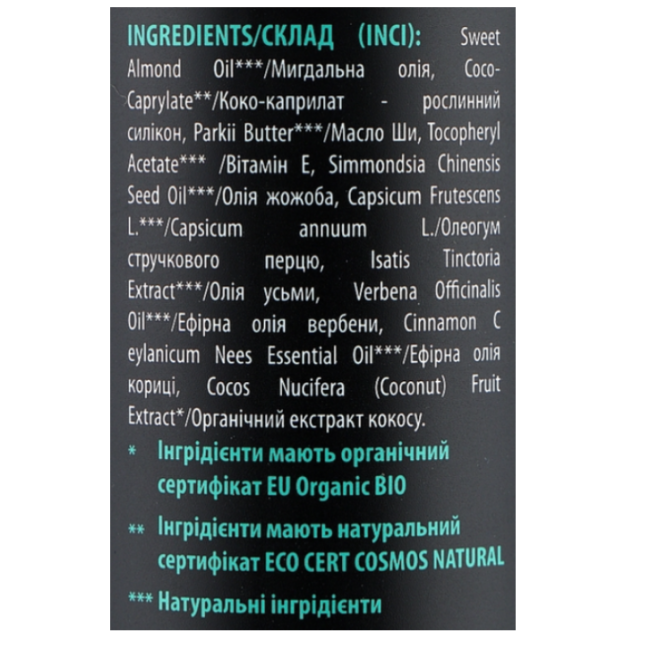 Состав: Sweet Almond Oil (Миндальное масло), Coco-Caprylate (Коко-каприлат — растительный силикон), Parkii Butter (Масло Ши), Tocopheryl Acetate (Витамин E), Simmondsia Chinensis Seed Oil (Масло жожоба), Capsicum Frutescens L. / Capsicum annuum L. (Олеорезин стручкового перца), Isatis Tinctoria Extract (Масло усми), Verbena Officinalis Oil (Эфирное масло вербены), Cinnamomum Ceylanicum Nees Essential Oil (Эфирное масло корицы), Cocos Nucifera (Coconut) Fruit Extract (Органический экстракт кокоса).