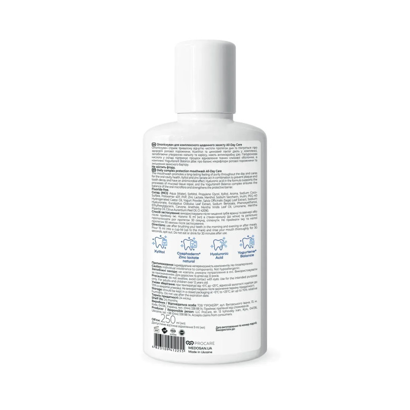 Ополаскиватель для комплексной защиты All-Day Care Medosan одновременно очищает, укрепляет, успокаивает и дарит долговременную свежесть. Основание на основе сорбита и пропандиола обеспечивает оптимальную консистенцию и комфортное использование, не пересушивает слизистую и помогает активным компонентам работать максимально эффективно. Ксилитол поддерживает здоровый баланс микрофлоры и способствует уменьшению образования налета.