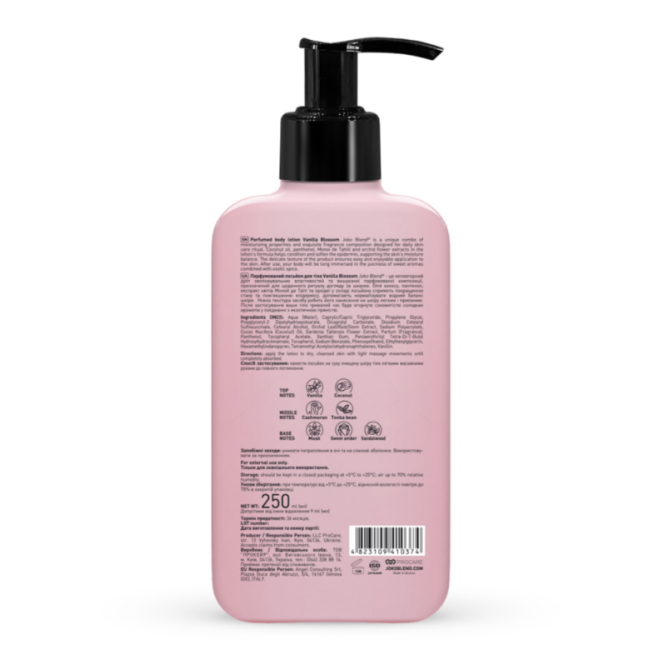 Парфюмированный лосьон Vanilla Blossom - сочетание интенсивного увлажнения кожи и утонченного парфюмерного дополнения. Лосьон имеет нежную текстуру, которая быстро впитывается, не оставляя липкости и даря коже мягкость, гладкость и ощущение комфорта. В составе есть масло кокоса - эффективно удерживает влагу, питает кожу и делает ее мягкой и шелковистой. Пантенол - успокаивает, способствует восстановлению и регенерации кожи, помогает уменьшить раздражение. Экстракт Моной де Таити - глубоко увлажняет и защищает кожу благодаря высокому содержанию антиоксидантов. Экстракт орхидеи - помогает сохранить молодость кожи, поддерживает ее упругость и уменьшает видимость мелких морщинок. Аромат Vanilla Blossom - теплый, уютный и чувственный, с мягкой сладостью и бархатным шлейфом. В этом аромате можно почувствовать кокос, кашемировое дерево, мускус и сандаловое дерево. Лосьон от Joko Blend интенсивно увлажняет, улучшает текстуру кожи, способствует релаксу и хорошему настроению.