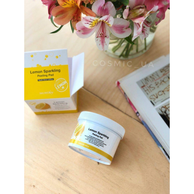 Диски Secret Key Lemon Sparkling Peeling Pad обеспечивают качественный поверхностный пилинг, который не травмирует кожу, выравнивает тон, избавляет от акне, угрей, камедонов. Этот продукт создан на основе салициловой кислоты – она ослабевает связь рогового слоя с базальной мембраной, нежно отшелушивает мертвые частички, тем самым ускоряет обменные процессы в клетках, избавляет от неровностей, шрамиков и следом после акне. Лимонное масло – осветляет, убирает пигментные пятна, выравнивает тон, насыщает витамином С. Экстракт солодки - активизирует синтез коллагена, восстанавливает разрушенные коллагеновые волокна, подтягивает, делает кожу более эластичной. Экстракт портулака - запускает в тканях процессы омоложения клеток, снимает раздражения и воспаления, успокаивает дерму. Фруктовая вода – смягчает, увлажняет, насыщает комплексом витаминов и минералов. Аргинин – защищает от вредного воздействия солнца, ветра и холода, образует невидимую пленку , которая фильтрует Уф лучи, способствует быстрому восстановлению кожного покрова. Аллантоин – заживляет микроранки и трещинки, разглаживает мимические морщинки, замедляет процесс старения. Пантенол - связывает молекулы воды и способствует задержанию влаги в клетках, активизирует процесс регенерации.