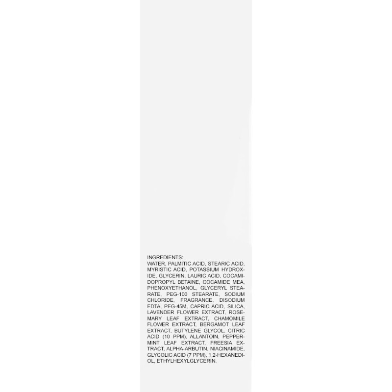 Состав: Water, Palmitic Acid, Stearic Acid, Myristic Acid, Potassium Hydroxide, Glycerin, Lauric Acid, Cocamidopropyl Betaine, Cocamide MEA, Phenoxyethanol, Glyceryl Stearate, PEG-100 Stearate, Sodium Chloride, Fragrance, Disodium EDTA, PEG-45M, Capric Acid, Silica, Lavender Flower Extract, Rosemary Leaf Extract, Chamomile Flower Extract, Bergamot Leaf Extract, Butylene Glycol, Citric Acid (10 ppm), Allantoin, Peppermint Leaf Extract, Freesia Extract, Alpha-Arbutin, Niacinamide, Glycolic Acid (7 ppm), 1.2-Hexanediol, Ethylhexylglycerin.