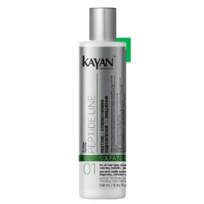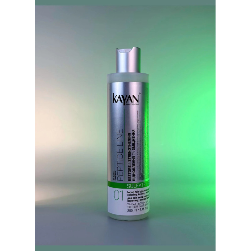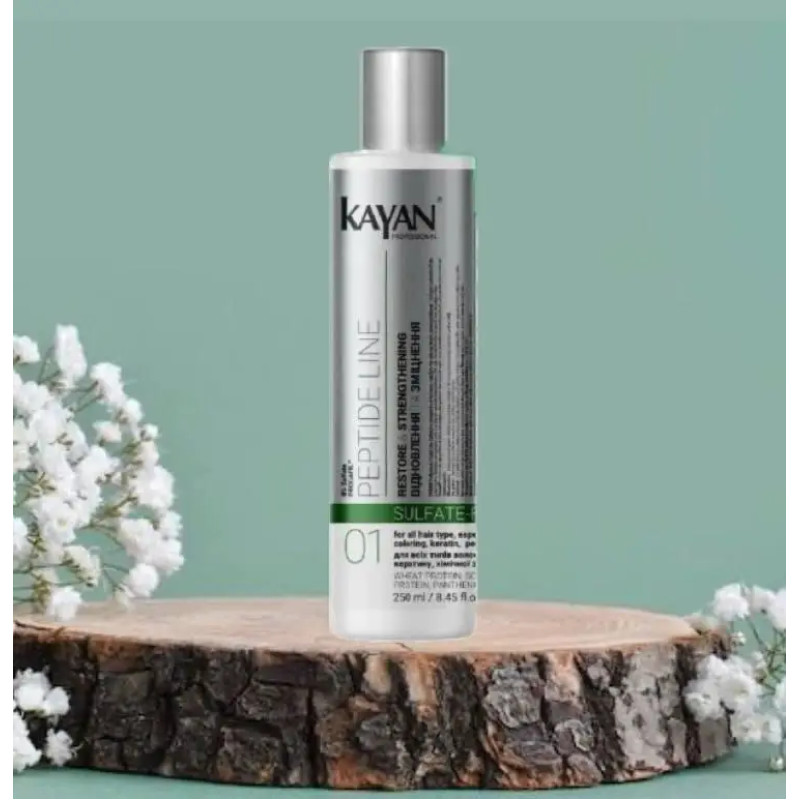 Безсульфатный шампунь Kayan Peptide Line Sufate-Free для всех типов волос, для локонов, которые подвергались окрашиванию, кератиновому излучению или химической завивке. Профессиональное средство, которое обеспечивает эффективное очищение кожи, не пересушивая корни волос и сохраняет естественное здоровье волос. Шампунь увлажняет, укрепляет волосы, придает им мягкость и поддерживает их в таком состоянии. Отсутствие сульфатов делает шампунь идеальным изделием для деликатного ухода. Гидролизованный пшеничный белок- улучшает способность волос задерживать влагу, и снижая ломкость волос. Пантенол также интенсивно увлажняет волосы, придает им блеск и гладкость, способствует быстрому восстановлению клеток. Гидролизованный соевый белок - это компонент помогает восстановить структуру волос. Шампунь обеспечивает увлажнение и укрепляет волосы, помогая восстановить их природную силу. Он повышает упругость локонов, уменьшает ломкость и предотвращает их повреждение. Средство стимулирует здоровый рост волос, делая их более густыми и крепкими. Благодаря мягкой формуле шампунь Kayan Professional подходит для ежедневного использования, не повреждая волосы и кожу головы.