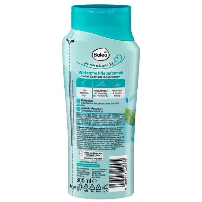 Шампунь Balea Anti-Schuppen предназначен для тщательной очистки волос и кожи головы, а также для решения проблем с жирностью, перхотью и раздражениями. Благодаря салициловой кислоте шампунь отшелушивает ороговевшие клетки, очищает поры и уменьшает образование перхоти. Пироктон оламина помогает бороться с грибками, что является причиной появления перхоти, и поддерживает здоровье кожи головы.