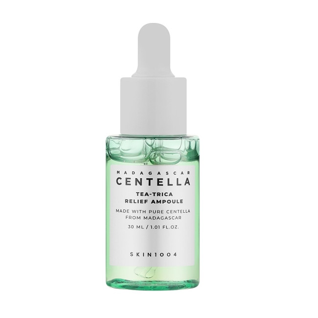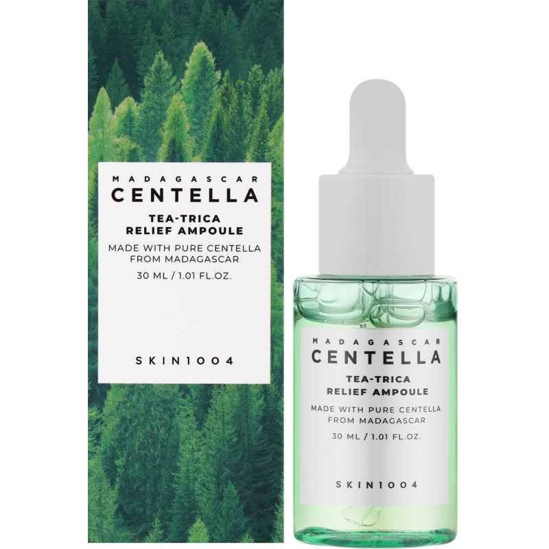Сыворотка антиакне с чайным деревом Skin1004 Madagascar Centella Tea-Trica Relief Ampoule содержит натуральные экстракты и увлажняющие компоненты, которые помогают успокоить кожу, уменьшить раздражение и поддержать ее увлажненность.