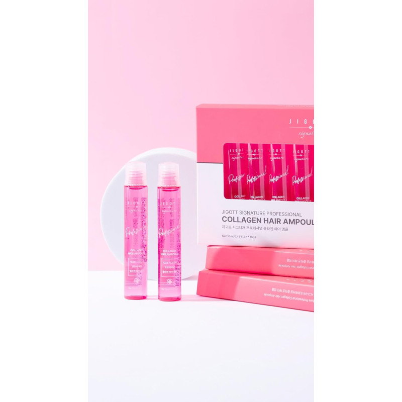 Jigott Signature Professional Collagen Hair Ampoule - средство, разработанное для качественного ухода за волосами у себя дома. Оно состоит из целого комплекса полезных ингредиентов, которые способствуют оздоровлению волос и делают их блестящими и красивыми. Визуальный эффект можно увидеть сразу после пользования, а если пользоваться длительное время, то восстановятся поврежденные участки и волосы будут защищены от внешнего воздействия. Активным компонентом в этих ампулах будет коллаген, он питает каждый волосок, он становится крепким и эластичным. Также в состав сыворотки входят растительные экстракты, которые имеют большое количество витаминов. Они помогают питать и восстанавливать волосы, они станут мягкими, гладкими и блестящими. Также средство от Jigott интенсивно очищает голову борется с перхотью и зудом, улучшает состояние корней волос.