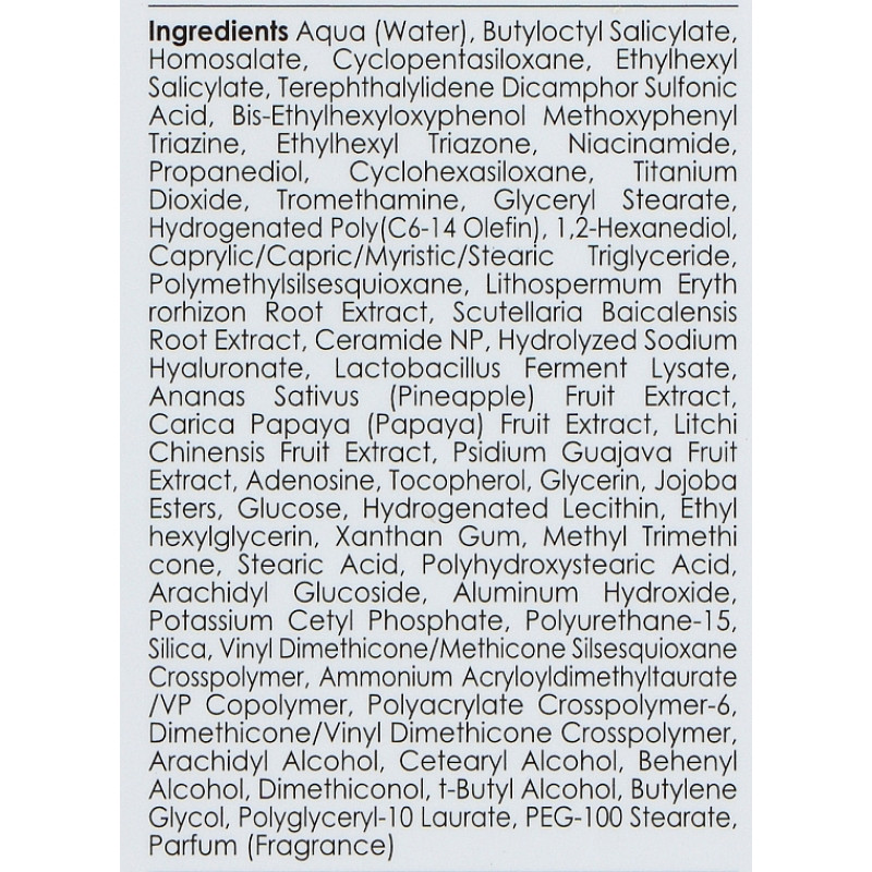 Состав: Aqua (Water), Butyloctyl Salicylate, Homosalate, Cyclopentasiloxane, Ethylhexyl Salicylate, Terephthalylidene Dicamphor Sulfonic Acid, Bis-Ethylhexyloxyphenol Methoxyphenyl Triazine, Ethylhexyl Triazone, Niacinamide, Propanediol, Cyclohexasiloxane, Titanium Dioxide, Tromethamine, Glyceryl Stearate, Hydrogenated Poly(C6-14 Olefin), 1,2-Hexanediol, Caprylic/Capric/Myristic/Stearic Triglyceride, Polymethylsilsesquioxane, Lithospermum Erythrorhizon Root Extract, Scutellaria Baicalensis Root Extract, Ceramide NP, Hydrolyzed Sodium Hyaluronate, Lactobacillus Ferment Lysate, Ananas Sativus (Pineapple) Fruit Extract, Carica Papaya (Papaya) Fruit Extract, Litchi Chinensis Fruit Extract, Psidium Guajava Fruit Extract, Adenosine, Tocopherol, Glycerin, Jojoba Esters, Glucose, Hydrogenated Lecithin, Ethylhexylglycerin, Xanthan Gum, Methyl Trimethicone, Stearic Acid, Polyhydroxystearic Acid, Arachidyl Glucoside, Aluminum Hydroxide, Potassium Cetyl Phosphate, Polyurethane-15, Silica, Vinyl Dimethicone/Methicone Silsesquioxane Crosspolymer, Ammonium Acryloyldimethyltaurate/VP Copolymer, Polyacrylate Crosspolymer-6, Dimethicone/Vinyl Dimethicone Crosspolymer, Arachidyl Alcohol, Cetearyl Alcohol, Behenyl Alcohol, Dimethiconol, t-Butyl Alcohol, Butylene Glycol, Polyglyceryl-10 Laurate, PEG-100 Stearate, Parfum (Fragrance).