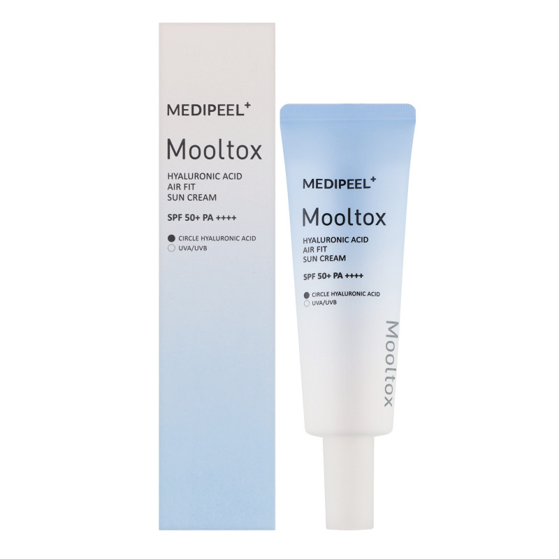 Солнцезащитный крем Medi-Peel Mooltox Hyaluronic Acid Air Fit Sun Cream, SPF 50+ PA++++ это надежная защита от UVA и UVB-лучей благодаря комбинации физических (титановый диоксид) и химических фильтров, таких как ethylhexyl triazone и polysilicone-15. Формула обогащена ниацинамидом, который осветляет кожу, улучшает ее барьерную функцию и уменьшает воспаление.