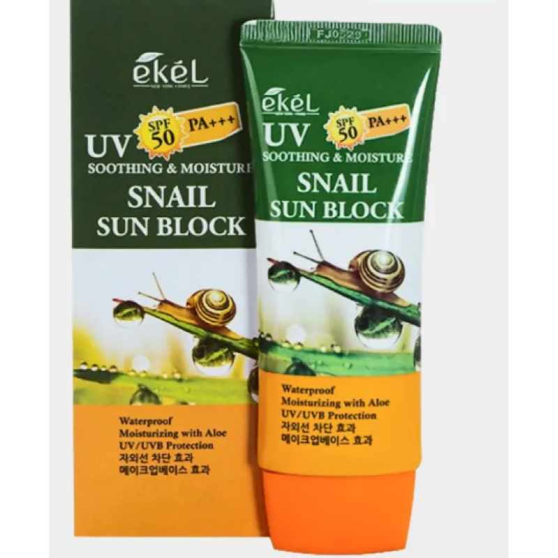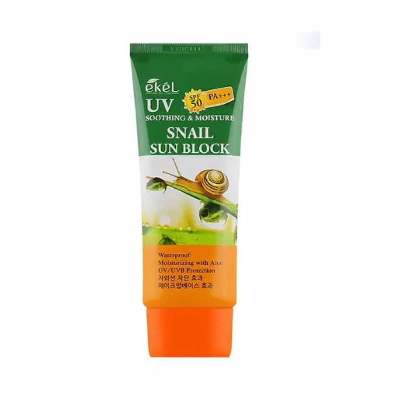 Крем Soothing & Moisture Snail Sun Block - позаботится о защите открытых участков на лице и теле от солнца. При нанесении он успокаивает и увлажняет кожу, устраняет шелушение и раздражение, а подарит ощущение свежести и комфорта. Основной компонент крема, это экстракт муцина улитки, который имеет уникальный химический состав. Он очень схож с человеческой кожей, поэтому слизь хорошо воспринимается нашей кожей. Муцин улитки стимулирует активность фибробластов, которые отвечают за формирование коллагена и эластина. Активация коллагена создает мощное клеточное обновление, замедляет процессы старения, кожа становится гладкой и упругой, морщины разглаживаются и осветляется пигментация. Муцин улитки в креме влияет как на глубокие проблемы в коже, так и на поверхностные в виде акне, бактерий и вирусов. Средство от EKEL демонстрирует защиту кожи от ультрафиолета и помогает избежать рубцов и шрамов.