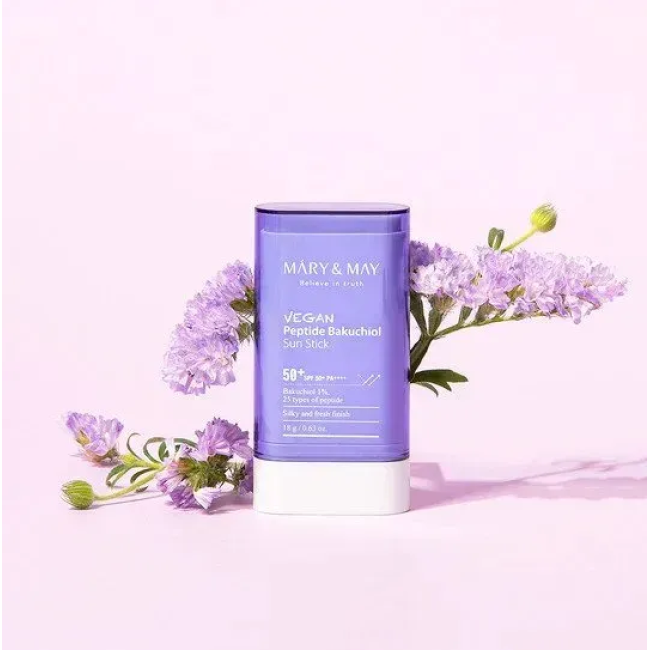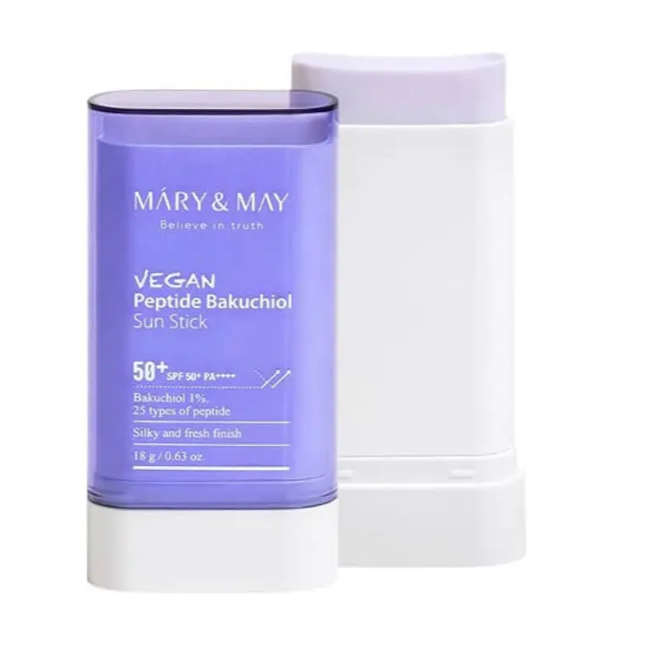 Солнцезащитный стик Vegan Peptide Bakuchiol Sun Stick SPF50+ PA++++ - защищает кожу в самую жаркую погоду благодаря современным фильтрам, которые способны защищать от 98% вредного излучения. Средство также содержит комплекс уходовых компонентов, которые поддерживают здоровье и молодость кожи. В составе есть бакучиол, который выражает антивозрастное действие, не вызывает раздражений и не повышает чувствительность к солнцу. Также бакучиоли стимулирует синтез коллагена, уменьшает мелкие морщинки, улучшает текстуру кожи, делая ее упругой и гладкой. 25 типов пептидов, которые работают над обновлением клеток, повышают эластичность и плотность кожи, уменьшают признаки возрастных изменений и улучшают общий тонус кожи. Витамин Е - мощный антиоксидант, который защищает кожу от быстрого воздействия окружающей среды и преждевременного старения. Стик обладает комфортным матовым финишем, не оставляя липкости. Средство от Mary & May делает кожу защищенной, гладкой и упругой.