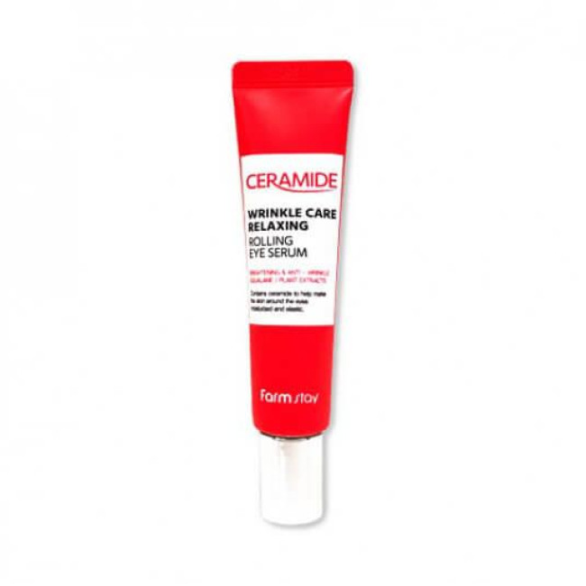 Сыворотка-роллер Ceramide Wrinkle Care Relaxing Rolling Eye Serum FARM STAY – имеет гелевую текстуру , на аппликаторе находятся три маленьких шарика, ускоряющих процесс нанесения и проникновения сыворотки в кожу. Средство разработано для эффективного омоложения зоны вокруг глаз.