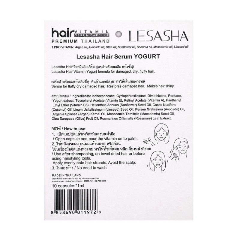 Тайские капсулы для волос с йогуртом Lesasha Hair Serum Vitamin Yogurt со сбалансированным составом сочетают интенсивный уход, защиту и восстановление структуры волос благодаря сочетанию сухих масел, витаминов и натуральных экстрактов.