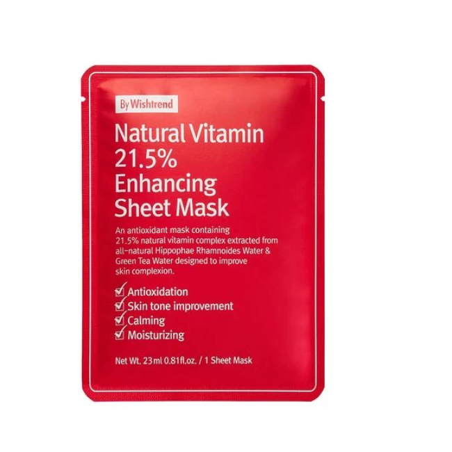 Маска Natural Vitamin 21.5% Enhancing Sheet Mask - средство, которое содержит гидролат облепихи, богатый витамином С, выравнивает тон кожи и придает ей естественное сияние. Средство создает не просто увлажнение, а комплексный уход, который сочетает в себе восстановление, питание и борьбу с первыми признаками старения. Экстракт зеленого чая - снимает воспаление, тонизирует и освежает. Гиалуронат натрия и гиалуроновая кислота - интенсивно увлажняют, сохраняют влагу в клетках, делают кожу мягкой и упругой. Бетаин - помогает удерживать влагу в эпидермисе, успокаивает раздражение и ускоряет регенерацию. Экстракт танжерина - укрепляет сосуды и предотвращает появление купероза. Маска проявляет себя, как легкий кислотный пилинг, осветляет и обновляет кожу, даря ей свежий и здоровый вид. Средство от By Wishtrend рекомендовано для сухой, комбинированной и зрелой кожи, и кожи в тусклом виде, которая имеет первые признаки старения и потери упругости.