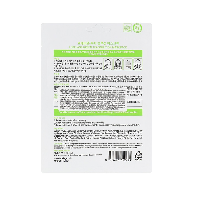 Тканевая маска Lebelage Green Tea Solution Mask предназначена для обеспечения глубокого увлажнения, питания и защиты кожи благодаря тщательно подобранному составу.