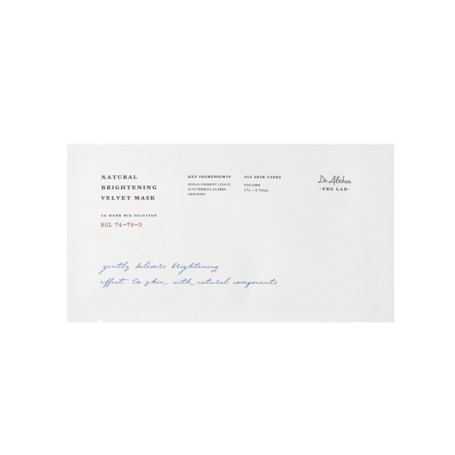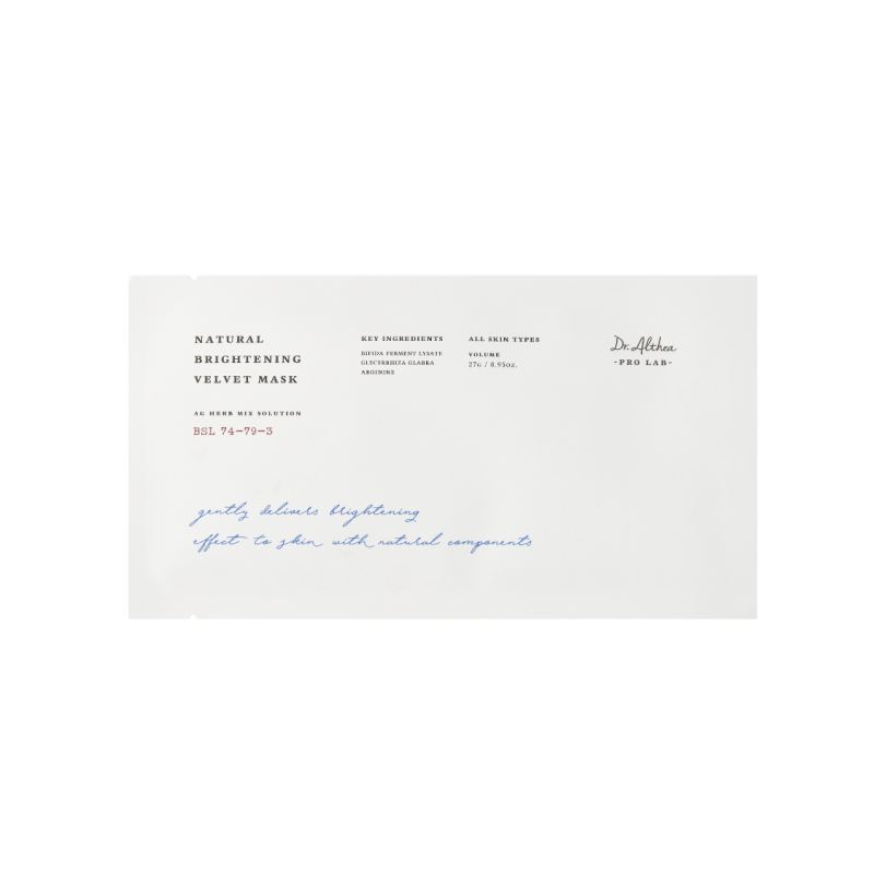 Маска Pro Lab Natural Brightening Velvet Mask - создана на основе 12 растительных экстрактов, глубоко питает, увлажняет и восстанавливает кожу. В основе лежит наномикрофибра, которая помогает маске плотно прилегать к лицу, обеспечивая эффективное проникновение компонентов. В составе есть аргинин - заживляет, укрепляет капилляры и защищает кожу. Аллантоин - сужает поры, успокаивает и стимулирует регенерацию. Сквалан - восстанавливает липидный барьер, смягчает и защищает. Экстракт камелии - мощный антиоксидант, замедляющий старение. Имбирь - тонизирует, освежает и стимулирует микроциркуляцию. Грейпфрукт - повышает упругость и сужает поры. Маска способствует выравниванию тона кожу, уменьшению пигментации и улучшению ее общего состояния. Средство от Dr. Althea идеально подходит для тусклой, чувствительной и уставшей кожи, которая нуждается в осветлении, успокоении и восстановлении.
