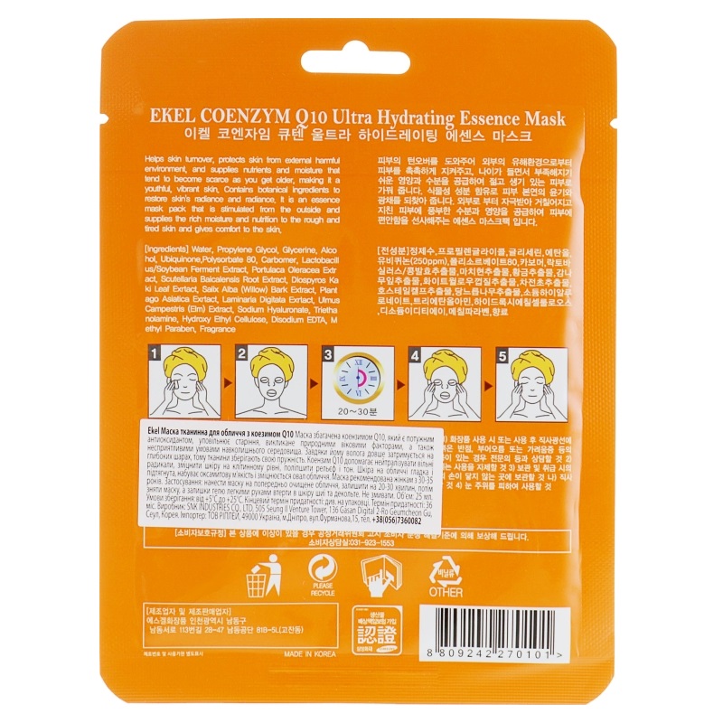 Тканевая маска EKEL Ultra Hydrating Essence Mask Pack Coenzym Q10 предназначена для ухода за кожей, требующей увлажнения, тонизации и защиты от преждевременных признаков старения. Основа из очищенной воды в сочетании с глицерином помогает поддерживать естественный уровень влаги, делает кожу мягкой, гладкой и эластичной. Легкая формула быстро насыщает кожу полезными веществами, не оставляя чувство липкости.