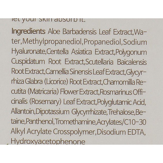Состав: Aloe Barbadensis Leaf Extract, Water, Methylpropanediol, Propanediol, Sodium Hyaluronate, Centella Asiatica Extract, Polygonum Cuspidatum Root Extract, Scutellaria Baicalensis Root Extract, Camellia Sinensis Leaf Extract, Glycyrrhiza Glabra (Licorice) Root Extract, Chamomilla Recutita (Matricaria) Flower Extract, Rosmarinus Officinalis (Rosemary) Leaf Extract, Polyglutamic Acid, Allantoin, Dipotassium Glycyrrhizate, Trehalose, Betaine, Panthenol, Tromethamine, Acrylates/C10-30 Alkyl Acrylate Crosspolymer, Disodium EDTA, Hydroxyacetophenone.