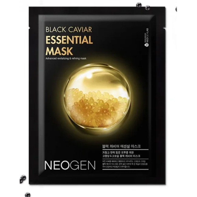 Маска Black Caviar Essential Mask має відмінний антиоксидантний зволожуючий засіб для будь-якого типу шкіри. Основа маски виготовлена зі 100% натурального кукурудзяного волокна, яке забезпечує щільне прилягання та концентроване насичення корисними елементами. До складу есенції входить екстракт чорної ікри , вона захищає дерму від окисних процесів, несприятливого впливу навколишнього середовища, вітру та холоду, надає ліфтинг – ефект. Аденозин – омолоджує, розгладжує мімічні зморшки, перешкоджає їх виникненню, уповільнює процес передчасного старіння. Екстракт часнику – виводить токсини з клітин, зміцнює їхній імунітет, прискорює обмінні процеси. Екстракт ягід акаї – пом'якшує, живить шкіру вітамінним комплексом, позбавляє сухості та лущення. Екстракт насіння сої – покращує еластичність та пружність дерми, помітно підтягує овал обличчя. Екстракт шовковиці – запобігає надмірному синтезу меланіну, освітлює небажану пігментацію та ластовиння. Екстракт рису - зволожує, перешкоджає випаровуванню вологи та пересушуванню епідермісу, зв'язує молекули води та залишає їх у клітинах, нормалізує природний РН баланс. Екстракт ожини – позбавляє таких недоліків як прищі, вугри, камедони, чорні крапки, бореться з хронічним висипом шкіри. Кунжутна олія – насичує амінокислотами та жирними кислотами, очищає пори від будь-яких забруднень та залишків навіть найстійкішої косметики, перешкоджає закупорці та утворенню сальних пробок. Екстракт лохини – освіжає, знімає сліди втоми та нестачі сну, прибирає набряки та темні кола під очима, дарує шкірі свіжий вид, що відпочив. Березовий сік - регулює роботу сальних залоз, звужує пори, робить їх менш помітними, нормалізує вироблення шкірного себуму. Екстракт щавля – знижує вираженість еритеми та перешкоджає появі вікових плям, зміцнює стінки судин, покращує мікроциркуляцію. Екстракт ялівцю – чинить антибактеріальну дію, перешкоджає виникненню шкірних інфекцій, вбиває шкідливі бактерії. Кастрове масло - вирівнює тон і рельєф шкіри, згладжує нерівності, позбавляє від слідів пост акне.
