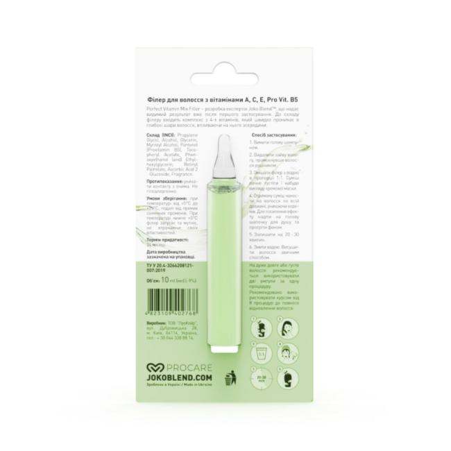 Філер для волосся створений для відновлення тьмяного, ослабленого та втомленого волосся. Засіб наповнює локони життєвою силою, повертає їм блиск, м'якість та пружність після першого застосування. В складі є вітамін С - захищає волосся від негативного впливу Уф-випромінювання. Вітамін А+Е - підвищує еластичність, зміцнює волосся та надає локонам пружності. Провітамін B5 - інтенсивно живить, зволожує, робить волосся блискучим та слухняним. В поєднанні вітаміни відновлюють волосся по всій довжині, зміцнюють структуру волосся, підвищують його еластичність. Волосся стає міцнішим, еластичним, шовковистим та доглянутим на вигляд. В результаті регулярного застосування засіб від Joko Blend розв'язувати проблему посічених кінчиків, забезпечуючи волоссю захист від негативного впливу від високих температур та хімічних засобів.