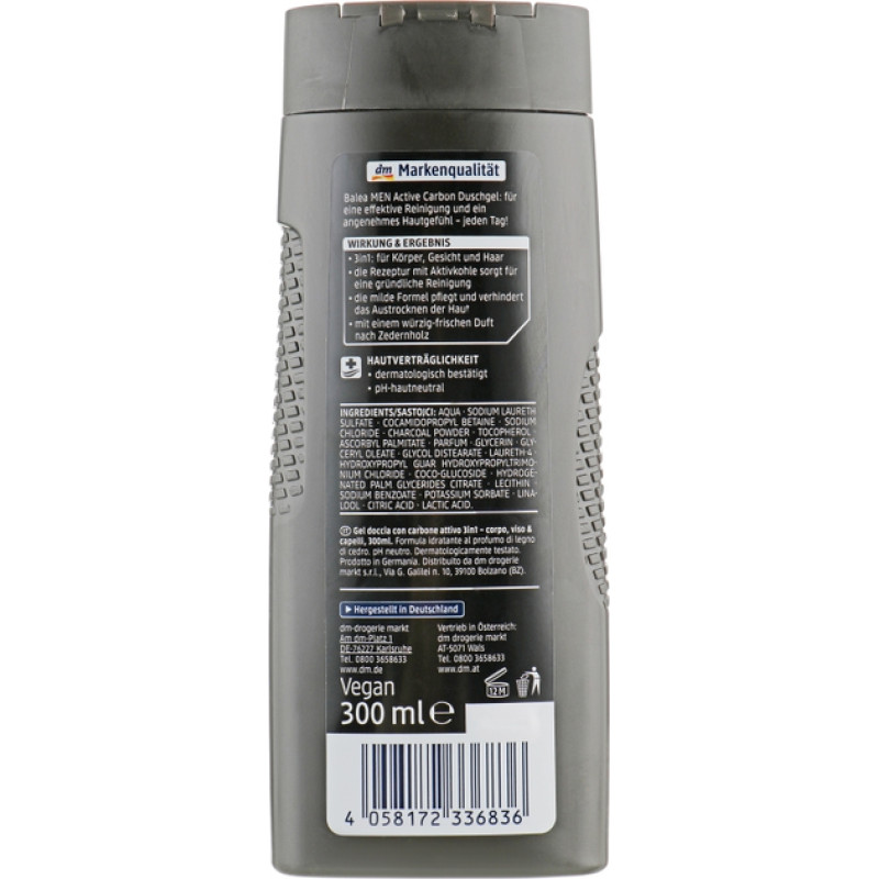 Гель для душу Men 3in1 Active Carbon - це універсальний гель, який подарує простоту і практичність, бо здатен замінити відразу три засоби: для тіла, волосся та обличчя. В складі є активоване вугілля, продукт, який ефективно видаляє забруднення, надлишок шкірного жиру та інші забруднення, при цьому забезпечуючи ідеальну чистоту. Гель володіє пряним ароматом з нотками кедра, який заряджає енергією та створює настрій на цілий день. Засіб створює тонізуючий ефект, який додає бадьорості та енергії. Нейтральний pH робить цей засіб ідеальним для щоденного використання і не пересушує шкіру. Гель для душу створює рясну піну і забезпечує легке нанесення. Засіб від Balea підходить для тих, хто цінує функціональність і приємний догляд.