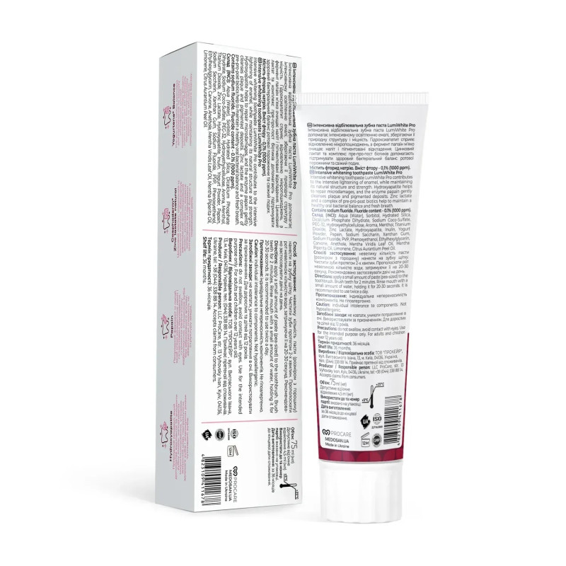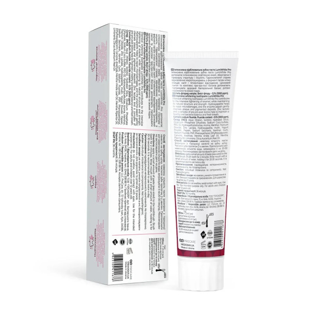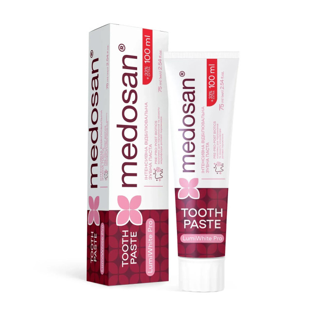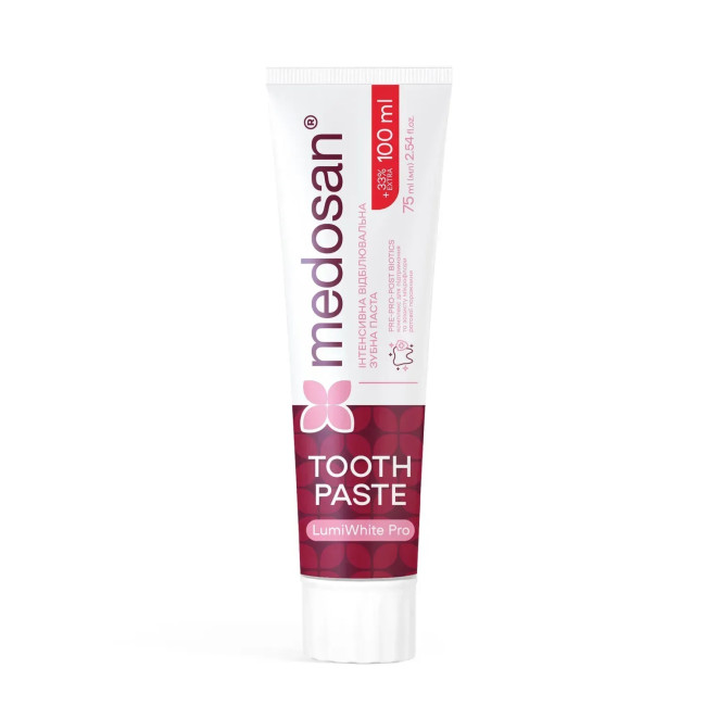 Інтенсивна відбілювальна зубна паста LumiWhite Pro Medosan поєднує делікатне відбілювання, м’яке полірування