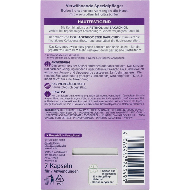 Концентрат Balea Konzentrat Retinol - засіб для боротьби зі зморшками та покращення стану шкіри. В складі є ретинол і натуральний підсилювач колагену бакучіолу, ці компоненти спричиняють природний синтез колагену і глибокій регенерації шкіри. Після тривалого користування цим засобом шкіра стане більш гладкою, еластичною і пружною, поступово будуть зникати прояви зморшок. Концентрат працює над стимуляцією відновлення клітин, природної пружності та гладкості. Засіб від Balea забезпечить тривалий ефект після користування, якщо протягом місяця наносити цей засіб, шкіра поверне собі молодість і пружність.