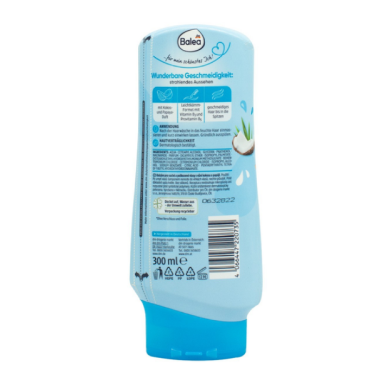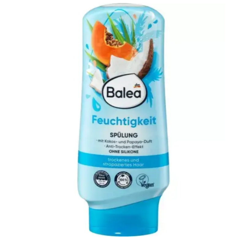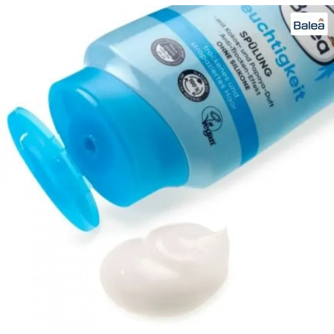 Кондиціонер зволожувальний - надає волоссю сяйва та доглянутого вигляду від коренів до кінчиків. Шампунь має м'яку формулу з вітаміном B3 та B5, які інтенсивно зволожують, робить пасма еластичними та повертає природний блиск. Комплекс активних інгредієнтів насичує волосся поживними речовинами, підтримує баланс вологи та створює захисний бар'єр від зовнішніх впливів. Кондиціонер має легку текстуру, яка рівномірно розподіляється, даруючи відчуття шовковистості та догляду. В складі є екстракт кокоса, який надає волоссю сяйва, живого блиску та еластичності. Засіб від Balea не містить синтетичних полімерів та полегшує розчісування.